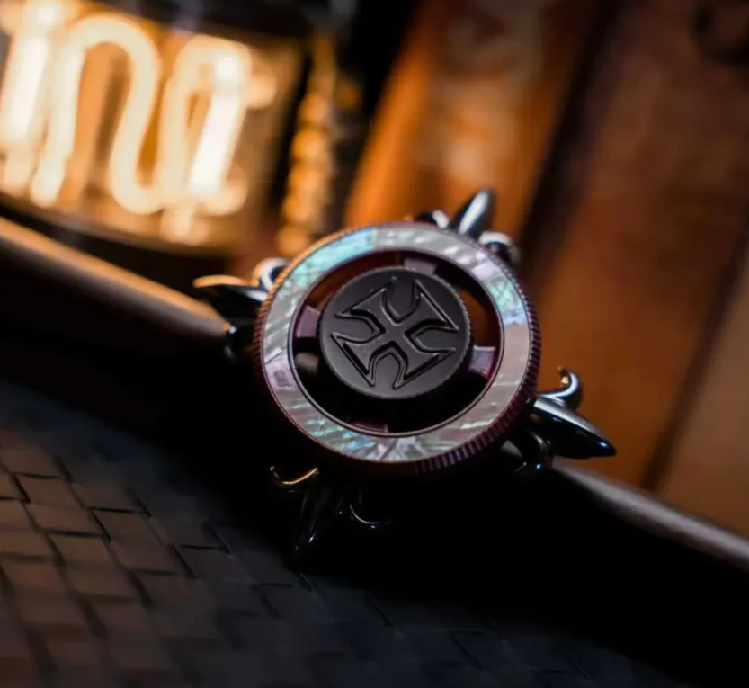 Upper cross and lower ring stack around a central bearing. The overlap creates a unique linked feel as it spins. -